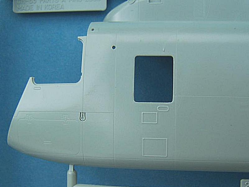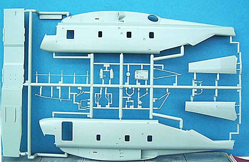Auf 8 Spritzgußrahmen verteilen sich rund 260 Bauteile. Bei dem ersten Übersicht erkennt man sofort die typische hohe Gußqualität der Firma aus Korea. Keine Gußgrate mit sauberen Details, z.B. im Cockpitbereich. Ansich sehr gut wiedergeben ist die Schallisolierung im Laderaum, welcher wieder in der schon vom CH-46 Kit bekannten Aufteilung in Innen- und Aussenhülle wieder gegeben ist. Leider befinden sich sichtbare Auswerfermarkierungen auf der Innenverkleidung, diese sollten sich aber schnell entfernen lassen. Die Ausstattung mit Sitzbänken erscheint zunächst spartanisch, ist aber beim Vergleich mit Originalbilder durch aus stimmig.