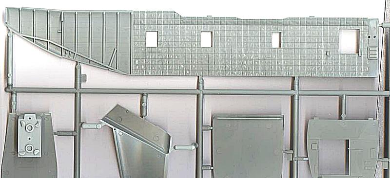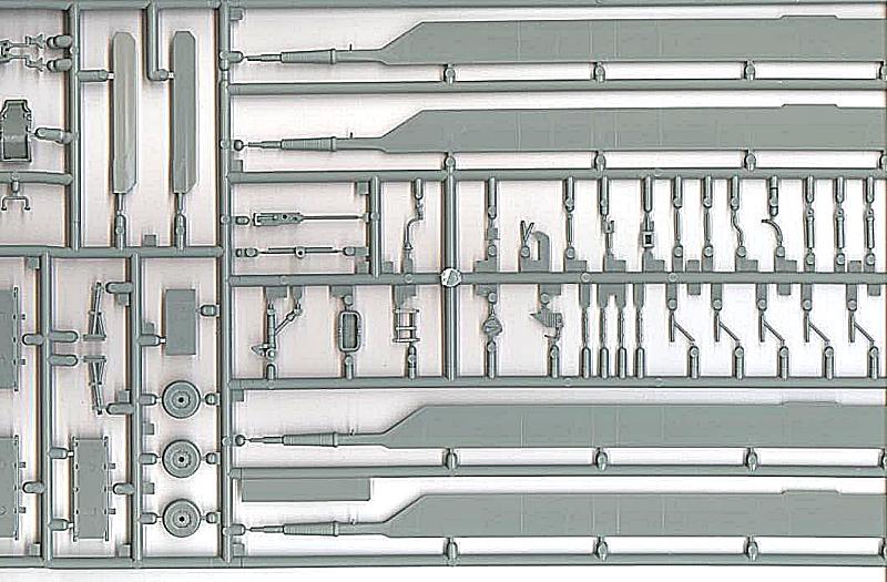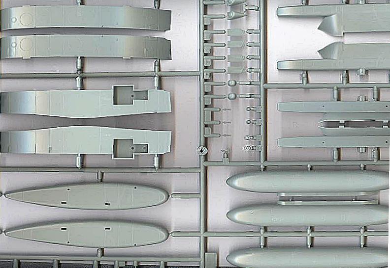 Der große Rumpf ist in drei Teile aufgeteilt. Damit sollte keine Passprobleme auftreten. Jedoch möchte ich hier auch mal einen Kritikpunkt festmachen, denn die typischen Nieten an der Aussenseite fehlen komplett. Die Gravuren sind allerdings sehr gut wiedergegeben, und die Lüftungsgitter am Heck sind auch sehr schön. Sie sollten nach entsprechender Bemalung keines Ersatzes durch Ätzteile bedürfen.