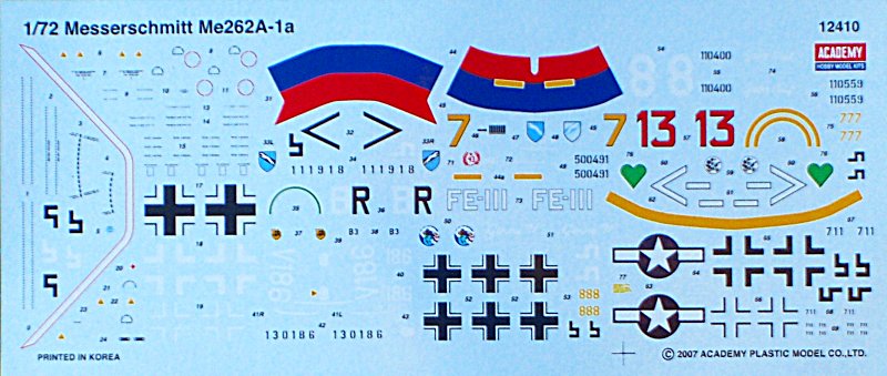 In den Bemalungshinweisen sind die RLM-Farbtonnummern angegeben. Obwohl der Decalbogen nicht sehr groß ist, hat man in Korea förmlich jeden Millimeter genutzt und für nicht weniger als 12(!) Maschinen die notwendigen Teile untergebracht. Die Seitenleitwerksmarkierungen sind geteilt vorhanden.