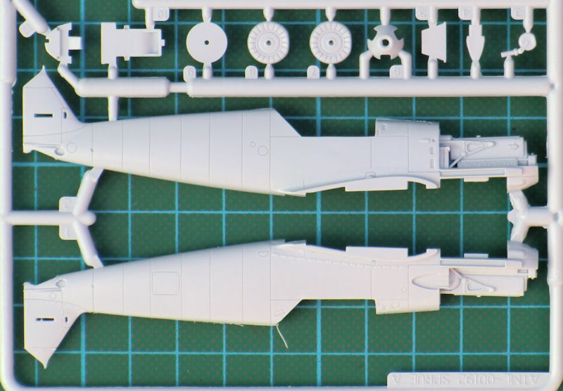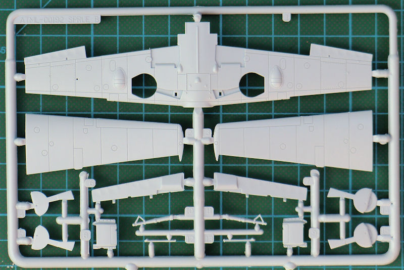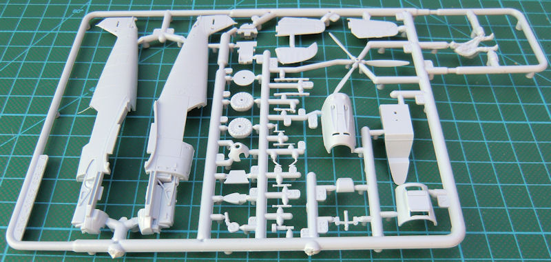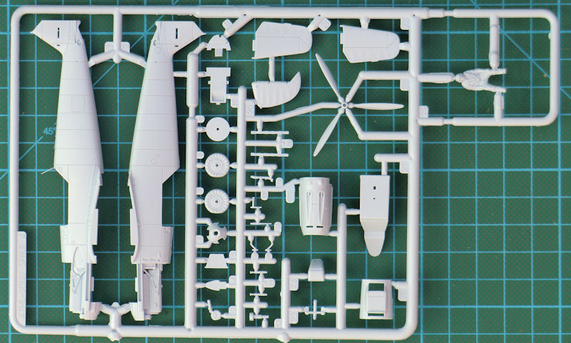 Die beiden Höhenleitwerkshälften sind aus einem Stück und auch das Seitenruder ist einteilig. Zwei separate Landeklappen und die an die Tragflächenunterseite anmodellierten Querruder versprechen einen leichten Zusammenbau. Somit sind die Hinterkanten schön scharf. Das Fahrwerk kann optional auch eingefahren eingebaut werden. Bei der ausgefahrenen Option sind die Hauptfahrwerksräder leicht abgeplattet. Die Kanzel besteht aus drei Teilen und kann alternativ offen montiert werden.