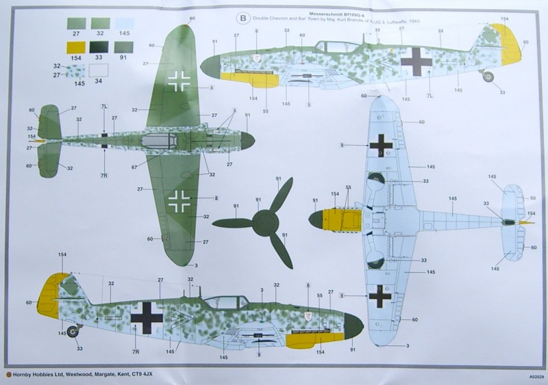 Vorbild: Die Messerschmitt Bf 109G-6 ist die wohl bekannteste Version des meistgebauten deutschen Flugzeugs. Aufgrund der Anforderungen war man gezwungen in die kleine Zelle immer größere und schwerere Waffen einzubauen. Der Einbau der MG 131 im Rumpf an der Stelle der bisherigen MG 17 erforderte diese für die G-6 und auch für die spätere G-14 so charakteristische Beulen.