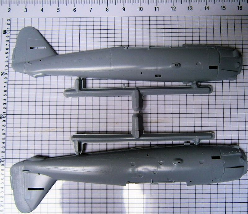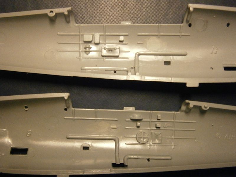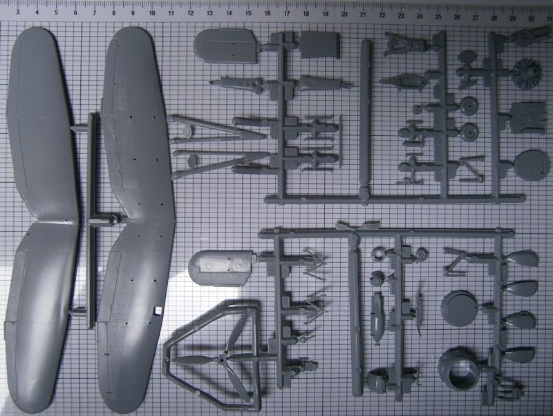 Abgesehen von den sehr feinen, absolut unaufdringlichen Panellines und Nietenreihen, waren es die vielen Details an den Seitenwänden im Cockpitbereich, die es bisher so nicht gab. War der Cockpitbereich bei Italaerei schon nicht schlecht hatte Airfix hier noch einiges hinzugefügt. Am Cockpitboden gibt es Pedale und neben dem Pilotensitz befinden sich links und rechts Konsolen. Auch das MG 15 wurde sehr ordentlich umgesetzt. Der Sitz des Beobachters hat die richtige Form und die Figur wurde in einer authentischen Pose dargestellt. Die Fronseite des Sternmotors war hier zwar nur als Relief nachgebildet sorgt aber trotzdem für einen naturgetreuen Eindruck. Der Spinner weist an seiner Spitze ein Loch auf was ebenfalls für ein hohes Maß an Authentizität sorgt. Die Klarsichtteile gehen für einen Bausatz dieses Alters völlig in Ordnung. Die wahlweise anzubringende Bombe ist jedoch definitiv zu groß geraten!