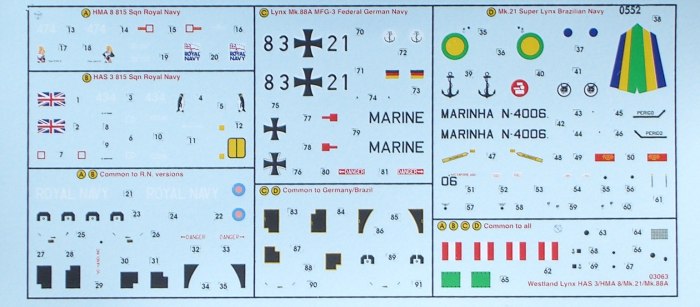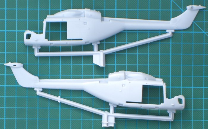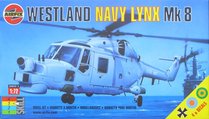 Bausatz: 1976 erschien der erste Lynx-Bausatz bei Airfix. Es gibt zwar noch ein paar weitere Lynx-Bausätze in 1/72, jedoch ist allein der Airfix-Bausatz ohne erhebliche Änderungen baubar. Der bei Revell im Programm befindliche alte Matchbox-Bausatz stellt einen frühen Prototyp dar und außer den Decals ist kaum ein Teil brauchbar. Fujimis Lynx sieht vielleicht gut im Kasten aus, hat jedoch auch Probleme in der Form und Maßhaltigkeit. Somit ist es logisch, dass Airfix im Jahr 2001 den vorhandenen Sea Lynx Bausatz mit einem neuen Spritzling aufgewertet hat.
