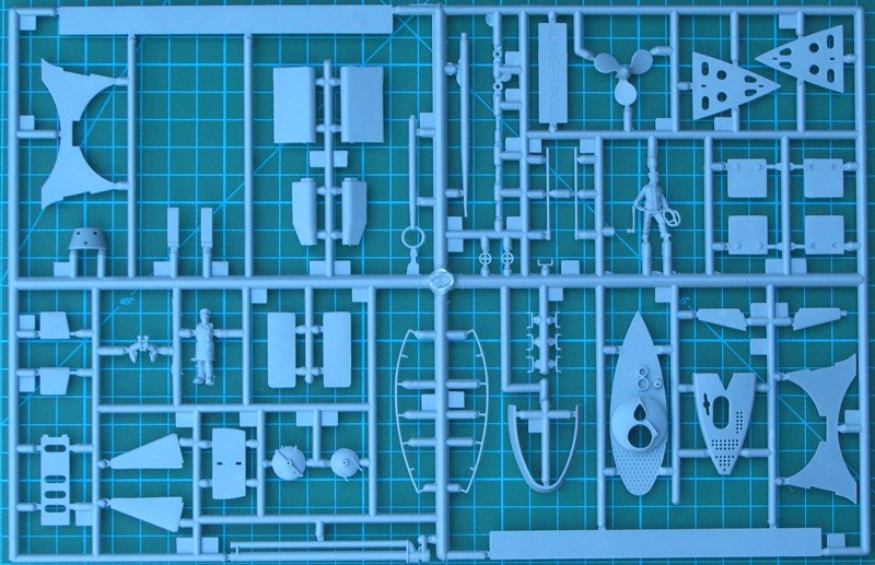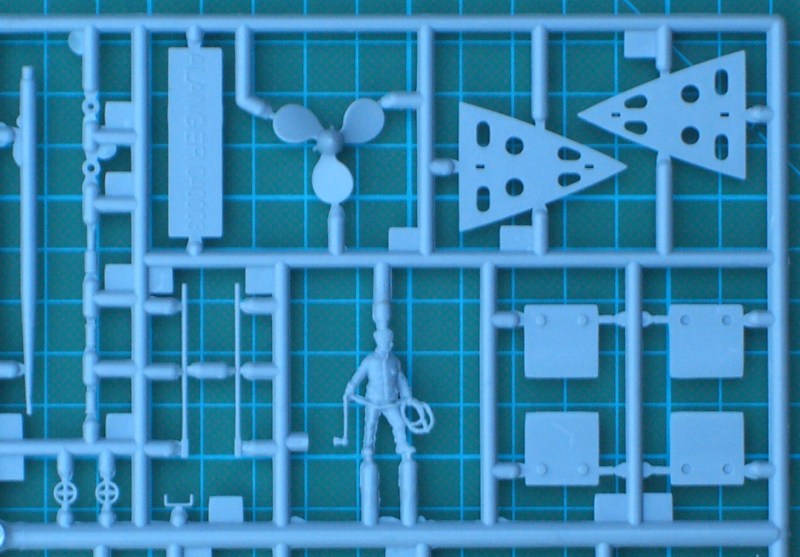 Der Rahmen mit den Kleinteilen ist gut abgespritzt und enthält neben dem Ständer auch noch sehr feine Spritzgussteile insbesondere für den Turm. Die Schraube ist wunderbar fein reproduziert. Als kleine Zugabe liefert ALANGER noch zwei Figuren. Beide Besatzungsmitglieder sind ordentlich proportioniert und auch in den Details sehr ordentlich. Die Bauanleitung sieht etwas provisorisch aus und wirkt etwas klein.