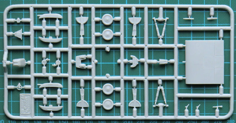 m typischen Amodel-Stülpkarton befinden sich gut verpackt hellgraue Spritzlinge mit 58 Bauteilen, ein Klarsichteil, ein großer Decalbogen und die übersichtliche Bauanleitung.