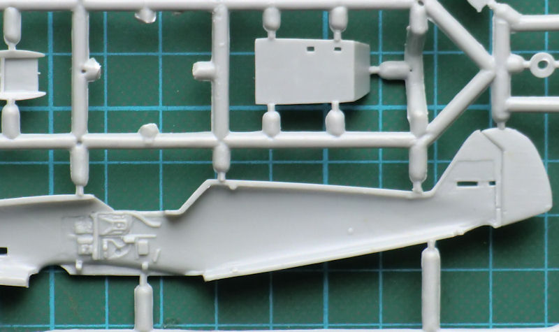 Alle Bauteile besitzen feine Strukturen und erinnern ein wenig an die FineMolds-Kits aus Japan. Beim rechten Rumpf hat Amodel sogar die Kabine massiv verkleidet. Der Bau beginnt mit dem einzigen Cockpit und das ist recht ordentlich detailliert. Das Instrumentenbrett besitzt passende Strukturen(dazu passt das vorhandene Instrumentendecal) und auf dem Sitz gibt es aufmodellierte Sitzgurte. Zusammen mit der Bodenplatte und den strukturierten Rumpfinnenseiten sowie dem Steuerknüppel entsteht ein gut aussgestattetes Cockpit. Eine Motornachbildung gibt es in diesem Bausatz nicht.