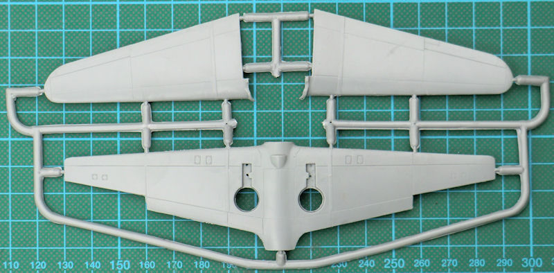 Das Cockpit besteht aus sechs Teilen und die Rumpfinnenseiten sind strukturiert. Da die Kanzel einteilig ist, muss hier kaum mehr gemacht werden. Der Aufbau von Rumpf, Tragfläche und Höhenleitwerk ist so gestaltet, dass immer scharfe Hinterkanten garantiert sind. Das ist vorbildlich und erspart viel Schleiferei.