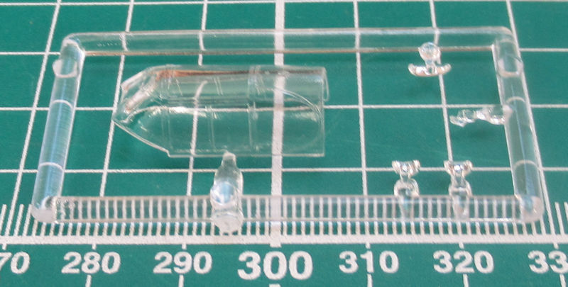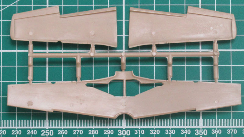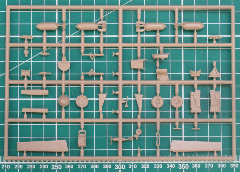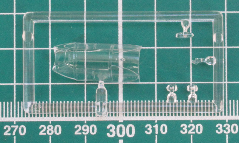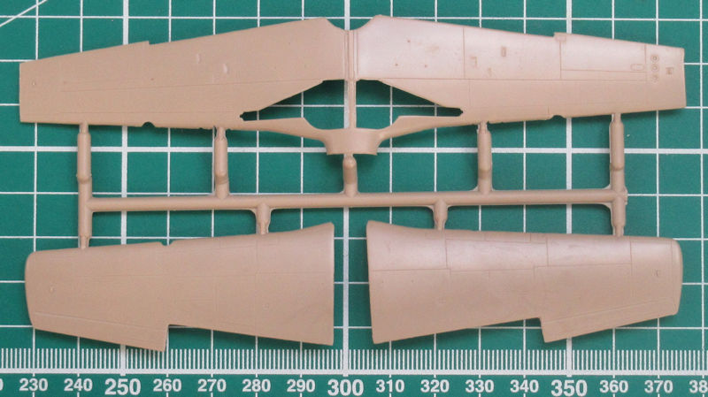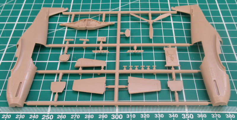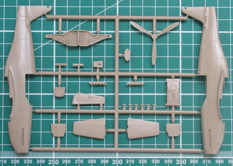 Die Luftschraube ist einteilig. Das einzige Resinteil ist für den großen Lufteinlauf unterm Rumpf. Ruder und Landeklappen haben scharfe Hinterkanten. Das Fahrwerk sieht ordentlich aus und die Klappen haben von innen auch schöne Strukturen. Die inneren Klappen sind am Boden verschlossen. Im Rumpfbug werden je nach Variante ggf. die MG-Nachbildungen eingebaut. Allerdings findet man im Bausatz nur eine einteilige Kanzel. Diese ist aber dünn und schön durchsichtig.
