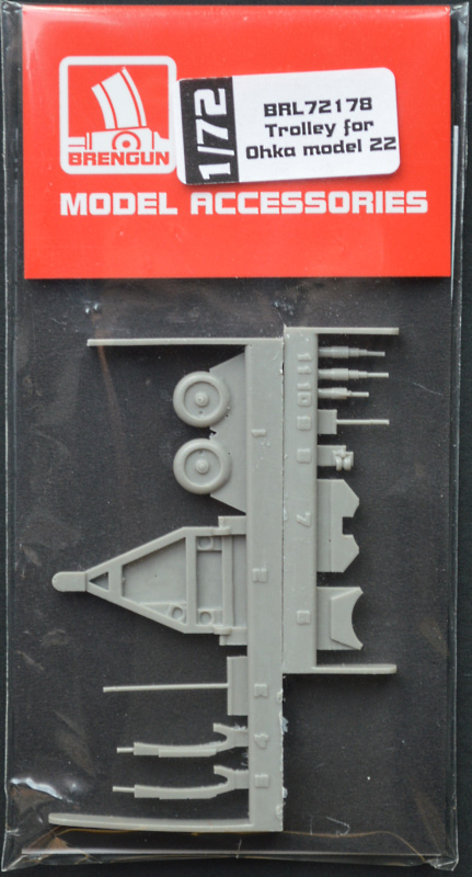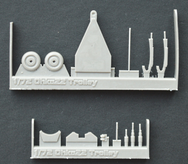 Bausatz: Die tschechische Firma Brengun bietet zu ihrer 1:72 Ohka Modell 22 einen passenden Transportwagen an. In der mit Karton stabilisierten Tüte befinden sich auf zwei Trägern verteilt insgesamt 13 Teile aus grauem Resin sowie die Bauanleitung. Der Guss ist gut und weist nur ein wenig Fischhaut sowie vereinzelt kleine Lufteinschlüsse auf. Selbst die dünnen Griffe sind gerade und sauber wiedergegeben. Somit sollten neben den Versäuberungs- und leichten Spachtelarbeiten keine weiteren Probleme auftreten.