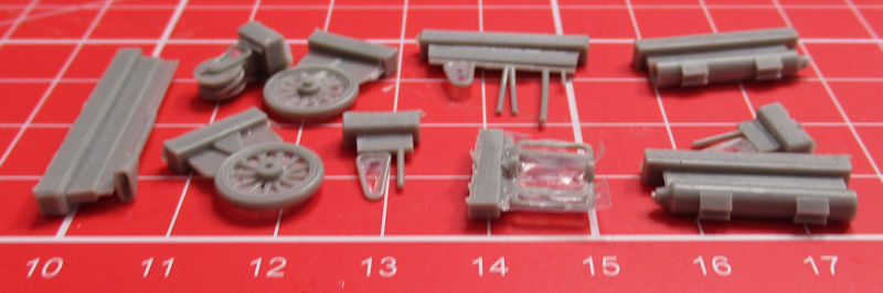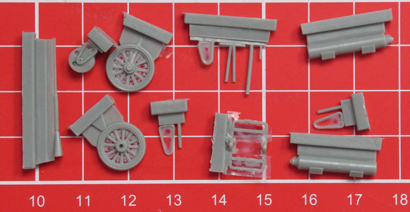 In der etwas unpraktischen Klarsichtverpackung befinden 15 sauber gegossene Resinteile und die zweiseitige Bauanleitung. Mit Hilfe der Teile lässt sich ein japanischer Feuerlöschwagen zusammenbauen. Zuvor muss nur noch etwas Gusshaut entfernt werden. Die beiden Räder haben schöne Speichen und ansonsten sind die Teile sehr filigran.