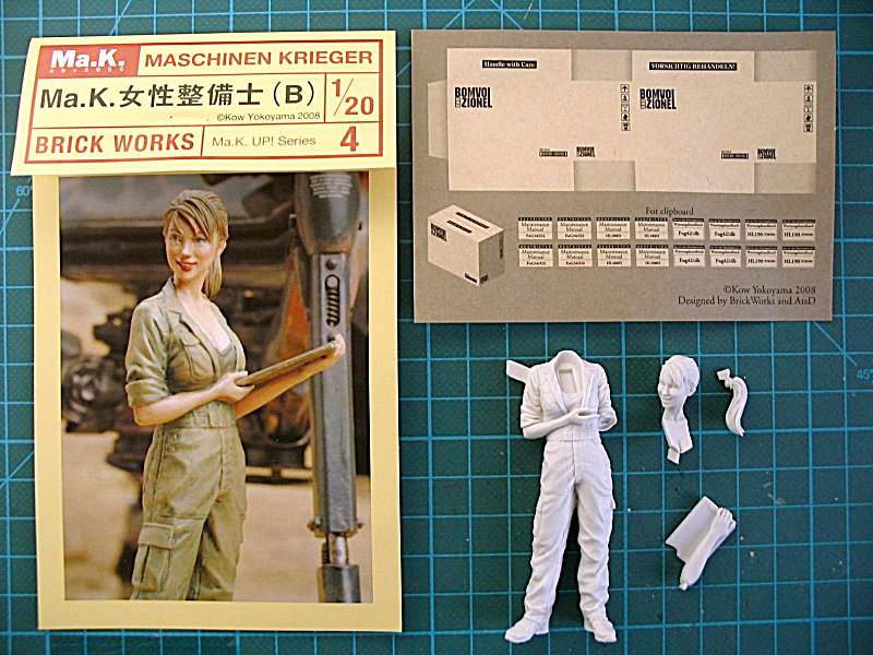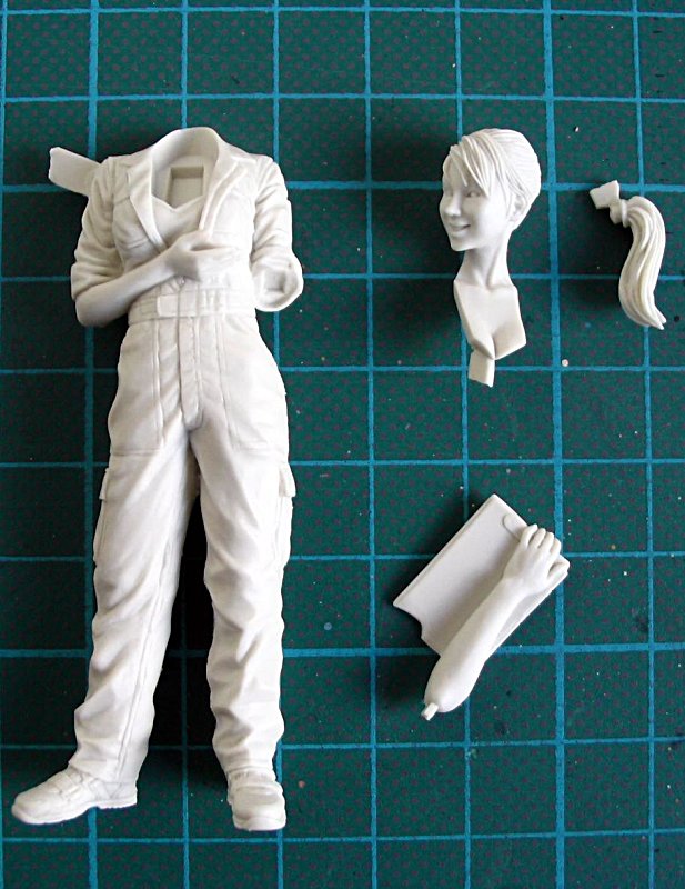 Die 4 Teile der Figur sind hochdetailiert und Grat-, Versatz- und Blasenfrei in feinem weissem Resin gegossen. Auch hier passt der Arm mit dem Klemmbrett wieder an die Figur, ohne nachspachteln zu müssen...die Kits von Brick Works sind eine wahre Freude. Als Bemalungsvorschlag für die Dame dient ein Farbfoto auf der Innenseite der Blisterrückwand.