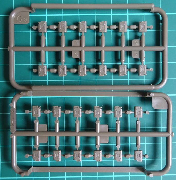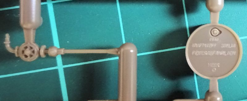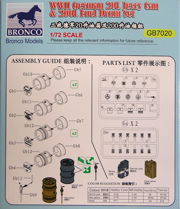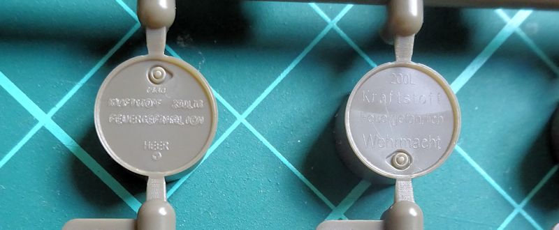 Da sich diese Zugabe meist auf Fahrzeuge beschränkte blieben die Flugzeugdioramenbauer von diesen Gaben ausgeschlossen. Diesen greift Bronco nicht nur mit Masse (acht Fässer, 24 Kanister), sondern auch mit Klasse unter die Arme. Die Fassdeckel sind deutlich und sauber mit "Wehrmacht, 200L, Kraftstoff, feuergefährlich" gekennzeichnet und das in den bei der Wehrmacht üblichen verschiedenen Ausführungen. Hinzu kommen noch zwei Kraftstoffhandpumpen.