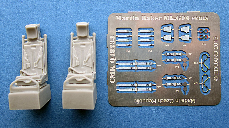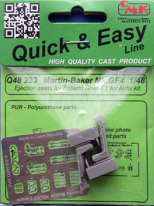 CMK hat in seiner Reihe von Zurüstteilen Marin Baker Mk.GF 4 Schleudersitze für die Folland Gnat von Airfix (Foland Gnat T.1 Red Arrows, Folland Gnat T.1) herausgebracht. Wie immer in der Q&E Serie befindet sich die Resinteile in einer Plastiktüte mit Papprücken. Wieder gibt es einen kleinen PE-Bogen in der Verpackung für abzugsbügel und die Gurte. Letztere sind leider nicht angegossen und müssen separat montiert werden. Ansonsten sind die Sitze fast aus einem Guss, lediglich der Bügel hinter dem Sitz ist ein separates Teil. Die Sitze des Bausatzes sind zwar o.k. aber nicht besonders detailliert.