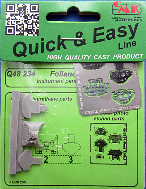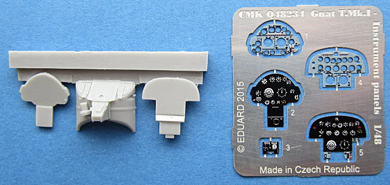 CMK hat in seiner Reihe von Zurüstteilen diese Instrumentenbretter für die Folland Gnat von Airfix (Foland Gnat T.1 Red Arrows, Folland Gnat T.1) herausgebracht. Wie immer in der Q&E Serie befindet sich die Resinteile in einer Plastiktüte mit Papprücken. Wieder gibt es einen kleinen bedruckten PE-Bogen von Eduard in der Verpackung für die Instrumentenbretter. Diese werden auf glatte Resinträger verklebt. Dazu gibt es noch die Instrumentenbrettabdeckung für das hintere Cockpit in Resin.