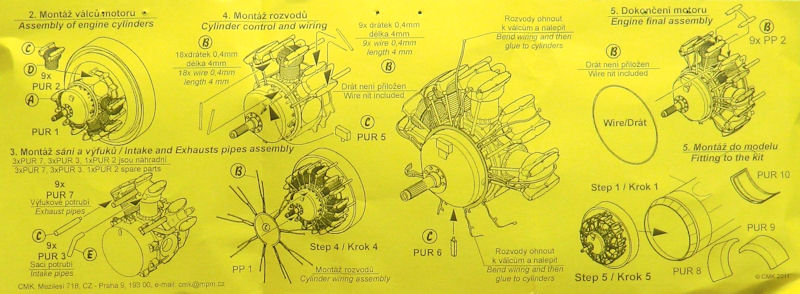 In der Blisterpackung befinden sich eine Fotoätztplatine, 29 feine Resinteile und die übersichtliche Bauanleitung. Die Resinteile sind blasenfrei abgegossen. Am Revell-Bausatz muss nur der Triebwerksansatz enfernt werden. Jeder der neun Zylinder wird einzeln auf das Motorengehäuse geklebt. Die 18 Stößelstangen müssen scratch angefertigt werden. Für die Zündkabel gibt es ein Fotoätzteil. CMK liefert auch die drei einzelnen Teile für die Motorhaube.