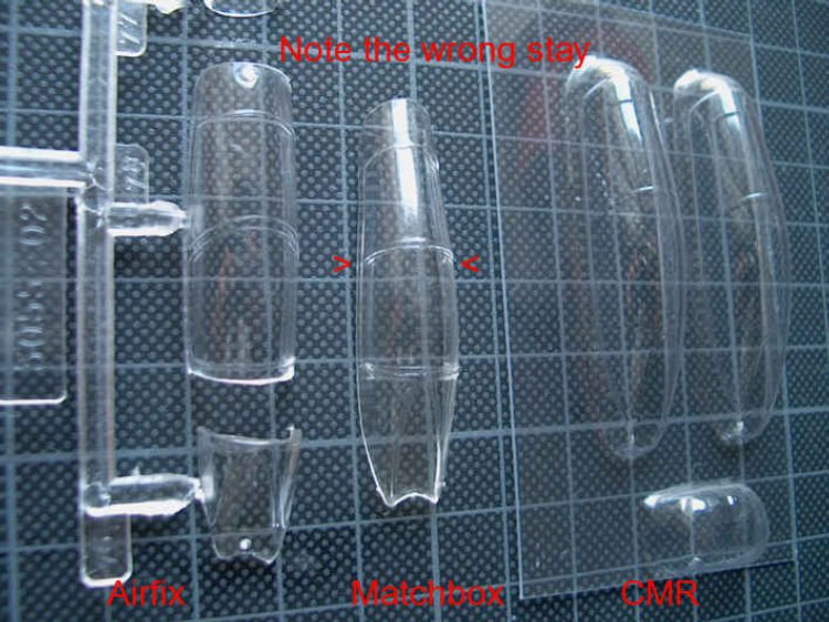 This model is the most basic of the whole lot, this toyish heritage is also reflected by the horrible three colours it was moulded in. It does not have a retractable airbreak or bomb bay unlike CMR and Airfix. The cockpit is nearly non-existant, instead of the regular cockpit-"tub" there are only horizontal bars molded into the inner side of the kit to hold the awful ejection seats (which look like office chairs). Without a dashboard or the clear windshield on the navigators controls it looks more like a hole to me. Another downside is the wrongly shaped canopy. The canopy frame in the middle should slope back and should not be completely vertical. As it is a clear part you will have a rather hard time correcting this.