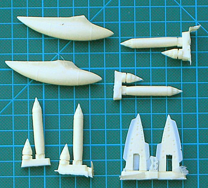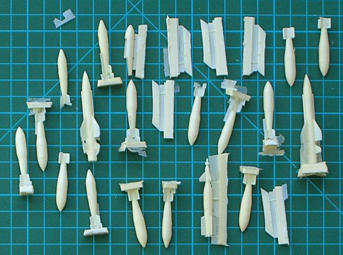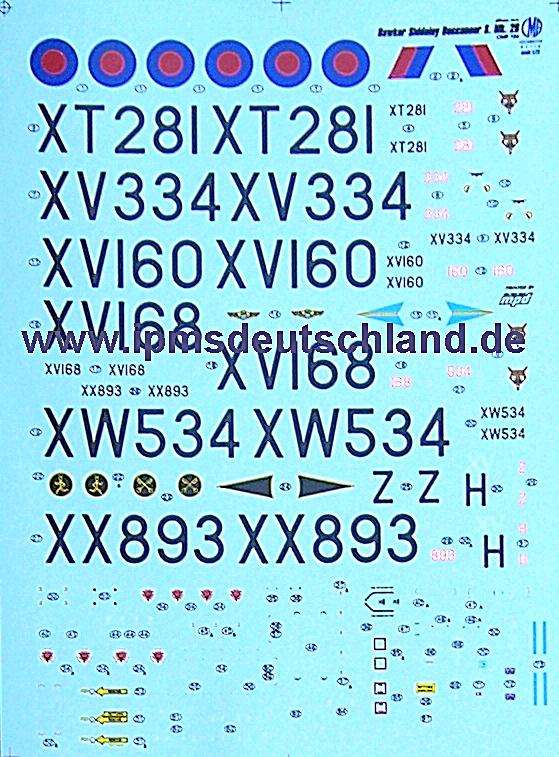 Weiterhin gibt es die Möglichkeit, die Tragflächen in geklappter Position und das Radardom sowie die Luftbremse in geöffneter Position zu montieren. Die Details sind hervorragend wiedergegeben. Als absoluter Kracher erweisen sich die Ausrüstungs-/Bewaffnungsoptionen des Bausatzes. Es sind u.a. verfügbar: AIM-9B Sidewinder, CPU-123/B "Paveway" Laserbomben, CBLS 100-Behälter für 28lb Bomben, AN/ALQ-101 "ECM"-Pod, AS-37 "Martel", 1000lb Bomben, Zusatztanks und No. 155 "Matra" Raketenbehälter. Die Decals sind auf zwei Bögen hochglänzend gedruckt.