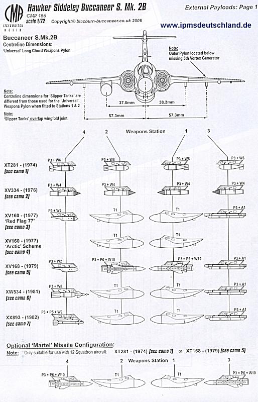 Bausatz: Was CMR hier abliefert ist ein Bausatz der Superlative. Schon auf der Spielwarenmesse 2006 war mir beim Betrachten der Bauteile klar, das wird der ultimative Buccaneer-Bausatz, der nach genauester Vorbildrecherche erstellt wurde. CMR liefert nun alle Bausätze in Kartons aus. Für die Buccaneer fiel er erwartungsgemäß etwas größer und stabiler aus. Schon die Bauanleitung mit 26 (!) Seiten fällt aus dem Rahmen. Sie enthält Fotos von den Originalen, detaillierte Angaben zur Bewaffnung und Bemalungshinweise für sieben Vorbilder.