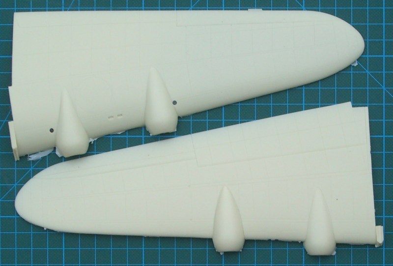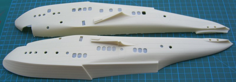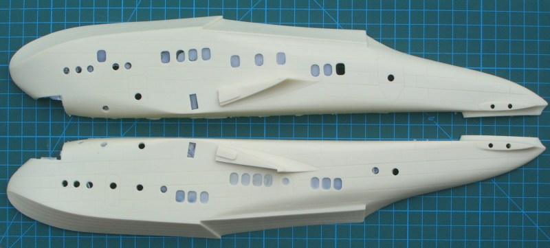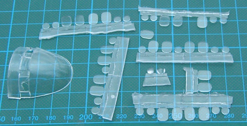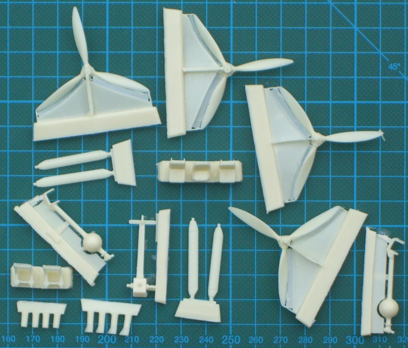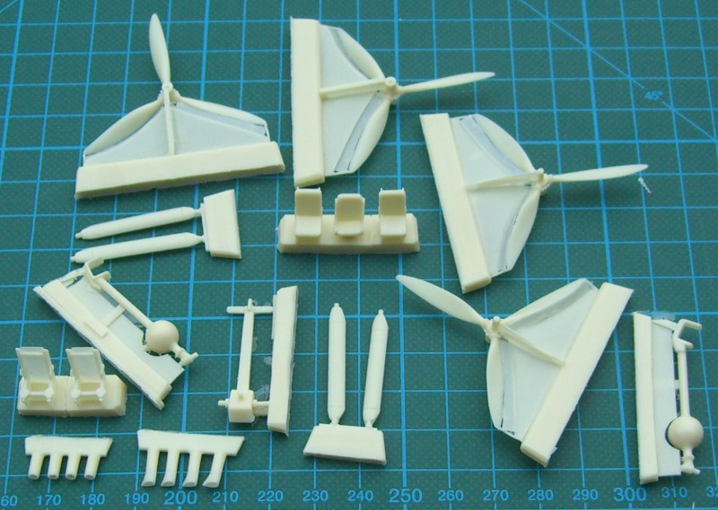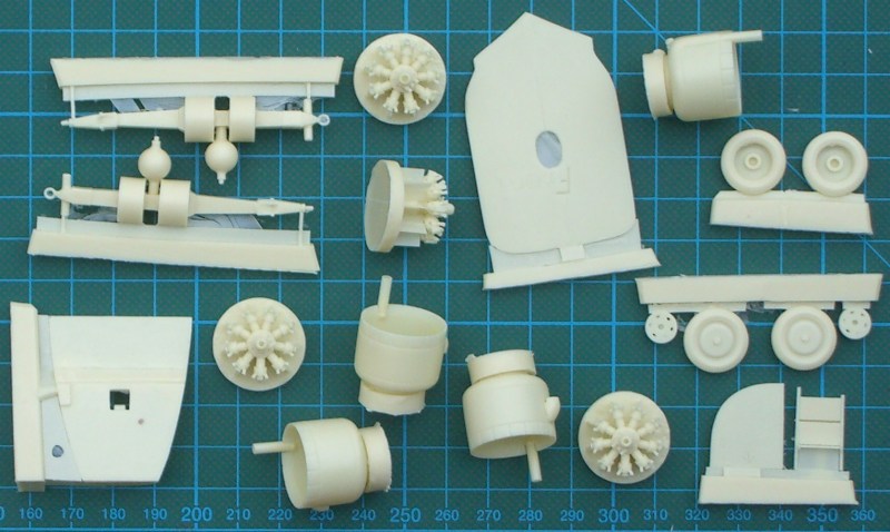 Das Cockpit hat eine tolle Einrichtung und wird aus feinen Resin- und z.T. Farbig bedruckten Fotoätzteilen erstellt. Es ist schon ein Modell für sich. Die Cockpithaube gibt es alternativ aus klarem Resin(erstaunlich dünn und durchsichtig) oder aus klarem Vacumaterial (immerhin für zwei Versuche). Eine Inneneinrichtung für die Fahrgastkabine gibt es nicht. Ehrlich gesagt: Wer würde die sehen, denn die beiden Kabinentüren sind geschlossen. Dafür wird aber noch ein Spant zur Stabilisierung des Rumpfe und der Holm für die Tragfläche eingezogen. Alle Fenster liegen aus sehr dünnen und klarem Resin bei. Natürlich gibt es auch Masken für die Lackierung! Die vier Tragflächenteile müssen vor der Montage noch Plan geschliffen werden. Alle vier Motore können gut detailliert werden. Dazu gibt es exakte Ansichten. Bei den Abgasrohren muss die jeweilige Bemalungsvariante beachtet werden bzw. Vorbildmaterial hinzugezogen werden.