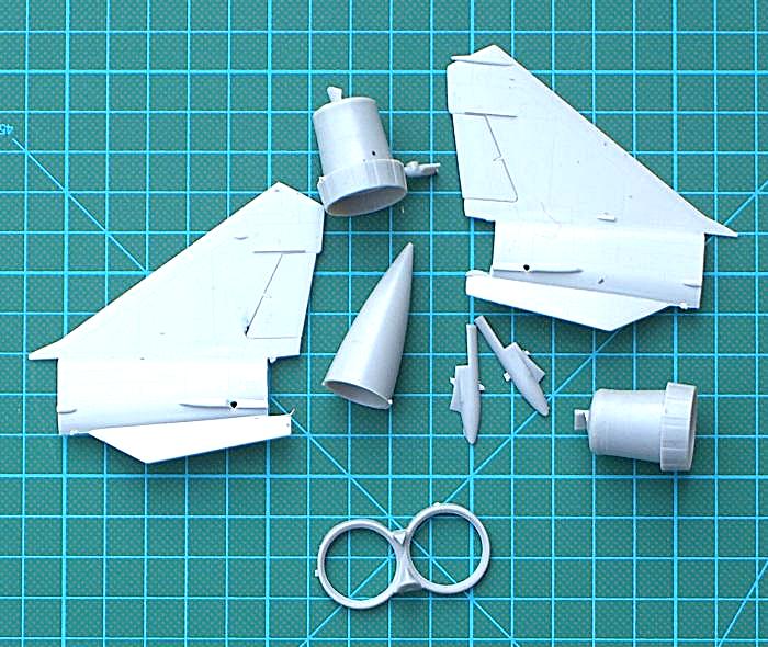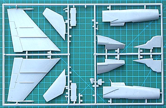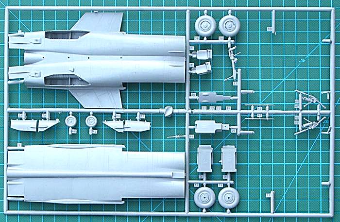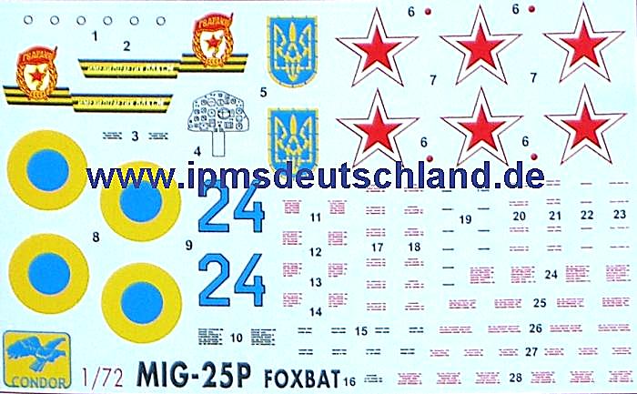 Bausatz: Condor aus der Ukraine hat schon einige MiG-Bausätze im Programm. Das sind u.a. die MiG-31, MiG-21-93, MiG-29 (9-13). Der Bausatz enthält drei graue Spritzgussrahmen. Einer davon ist für die Raketenbewaffnung. Ein paar Teile waren lose. Die Teile sind gut und fein graviert. Schön finde ich insbesondere die sehr tiefen Hauptfahrwerksschächte. Das Cockpit enthält Teile für einen Schleudersitz, Steuerknüppel, Cockpitwanne und Instrumentenbrett. Die Triebwerksauslässe sind ganz brauchbar detailliert. Das gilt ebenso für die Fahrwerksteile. Für den Rumpfbug ist ein wenig Ballast zur Sicherheit einzuplanen. Auf dem Decalbogen sind auch eine Menge Wartungshinweise. Leider sind dafür keine Hinweise in der Bauanleitung enthalten.