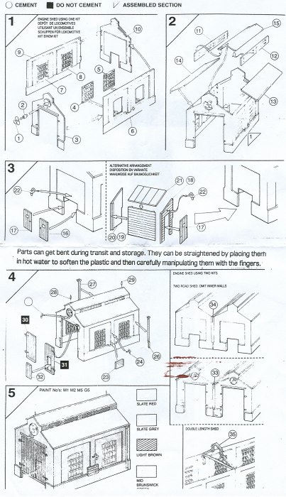 Der Bausatz ist einfach gehalten und ermöglicht in wenigen Schritten den Bau eines einständigen Lokschuppens aus der Blütezeit der Eisenbahn. Die in der Anleitung vorgegebenen Farbangaben lassen sich aber heute nur noch schwer umsetzten, den wer kennt noch M1, M2 M5 und G5 von AIRFIX? Bei einem Ziegelbauwerk stellt das aber kein Problem dar.