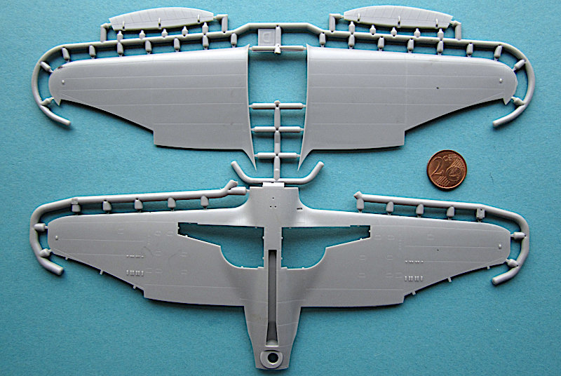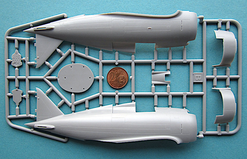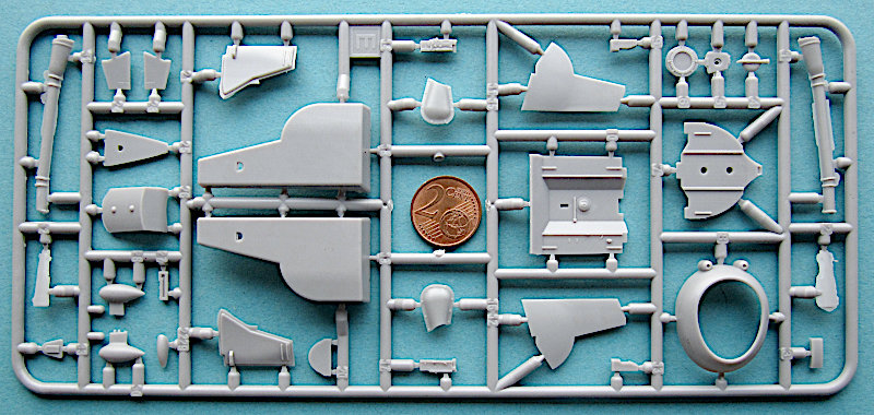 Um es gleich vorweg zu nehmen: auch dieser Bausatz fällt in die Kleinserienkategorie und muss mit entsprechender Vorausplanung gebaut werden. Es gibt hier und da etwas "flash" und Löcher und Passzapfen sucht man vergebens. Persönlich bevorzuge ich die Anbringung der Angüsse auf den Klebeflächen, da man so beim Versäubern weniger von der Modelloberfläche zerstört. Die Oberfläche des Modells ist glatt – hat also keine Orangenhaut: Die Gravur ist fein und konsistent. Nietenreihen gibt es nicht. Die Steuerflächen liegen separat bei und können dementsprechend ausgelenkt dargestellt werden. An den Ruderfinnen sind mir Sinkstellen aufgefallen, die gespachtelt werden sollten.