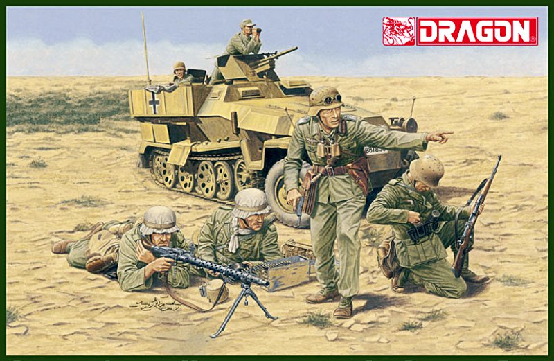 Bis dato musste man gewaltig an vorhandenen Figuren herumschnitzen oder auf die alten Airfix Figuren im Maßstab 1:32 zurückgreifen, wenn man deutsche Soldaten des Afrika Korps bauen wollte. Diese Lücke füllt nun Dragon in gekonnter Manier. Auf dem ansprechenden Deckelbild, das die Handschrift von Volstadt aufweist, sieht man auf den ersten Blick, dass es immer noch einige Möglichkeiten gibt, neue Posen darzustellen.