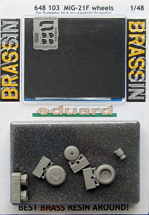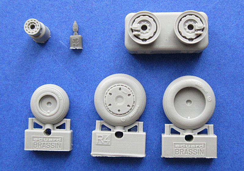 Dieser in der Brassin Linie erschienene Satz erlaubt den Austausch der Räder des Bausatzes. Die Teile sind wie immer Tadellos gegossen und enthalten separate Felgen (eine Seite) mit Bremsen und Aufnahmeloch für die Achse des Bausatzteils. Für die Bugradgabel ist ein kleines Resinteil für die Anbringung der Bremsleitungen beigefügt. Einige Abschnitte selbiger liegen als Fotoätzteile bei.