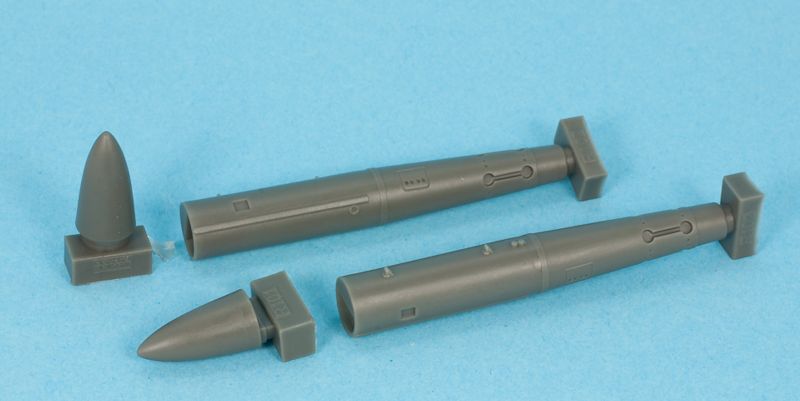 Bausatz: In der durchaus etwas überdimensionierten Verpackung finden sich zwei fein gegossene Bombenkörper, hauchdünne Stabilisierungsflossen (da scheint wirklich das Licht durch!) sowie je nach Variante die passende Bombenspitze.
