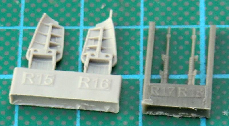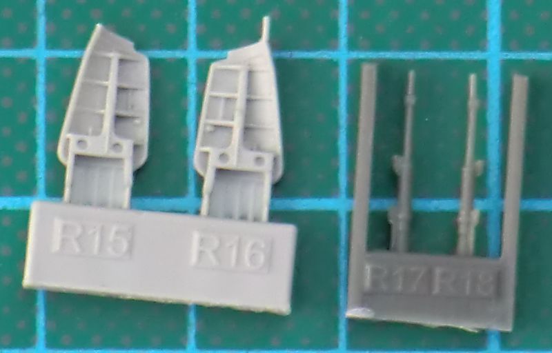 Das Set enthält vier sauber gegossene Resinteile, eine Fotoätzplatine und die gute Bauanleitung. Die Resinteile liefern die zwei Luftbremsen und die Hydraulikzylinder. Die Fotoätzteile detaillieren das Innere des Rumpfes.