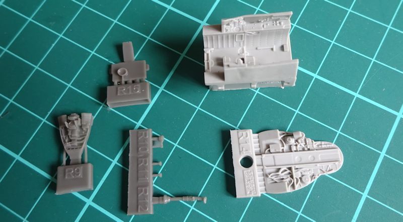 Die Cockpitteile sind sauber aus grauem Resin gegossen. Weitere Details können mit den Ätzteilen dargestellt werden. Für das Visier gibt es eine kleine Folie.