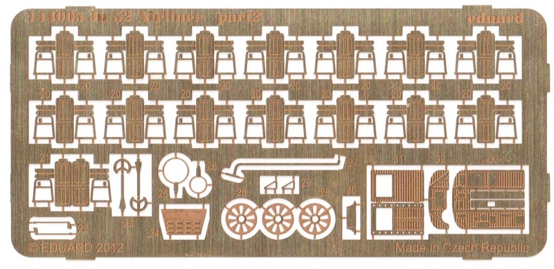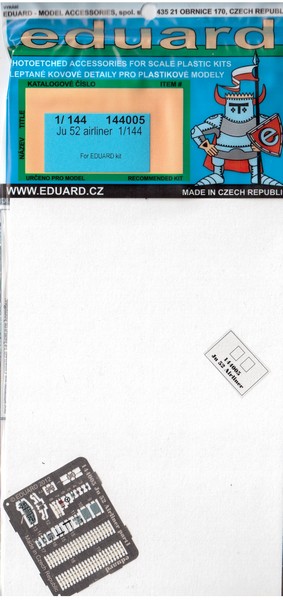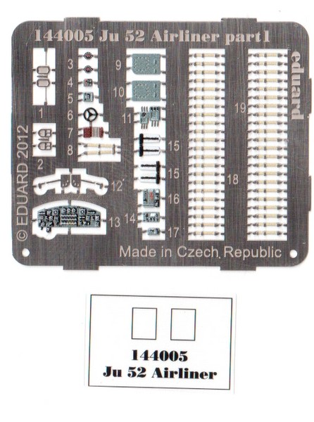 Für seinen eigenen neuen Bausatz der zivilen Junkers 52 hat Eduard gleichzeitig das passende Fotoätzteileset auf den Markt gebracht. Es enthält zwei Platinen und einen dünnen Film zur Darstellung der Fensterscheibe in der Kabinentür. Der eine Bogen ist bereit farbig bedruckt und enthält im Wesentlichen die Teile für das Cockpit sowie die Gurte für die Kabinensitze.