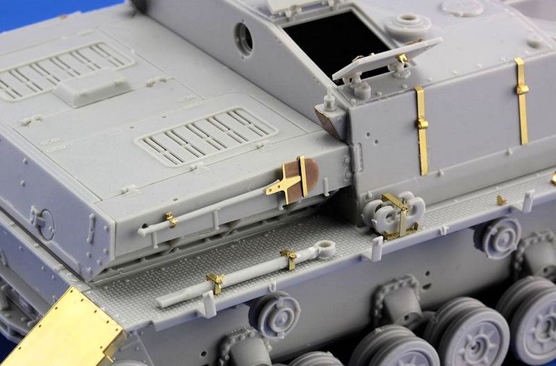 Anhand der vierseitigen, wie immer sehr ausführlichen Bauanleitung, werden in chronologischer Reihenfolge folgende Teile ergänzt oder ausgetauscht: Die vorderen Abdeckungen der Ketten, die Halterungen der Ersatzketten, die Abdeckungen der vorderen Sichtluken, der vordere Boschtarnscheinwerfer, sämtliche Werkzeughalter, die hinteren Abdeckungen der Ketten, das hintere Tarnrücklicht, der Wagenheber, der Unterlegklotz (hierfür gibt es ein extra strukturiertes Ätzteil mit angedeuteter Holzmaserung) und diverse Details an den Luken.