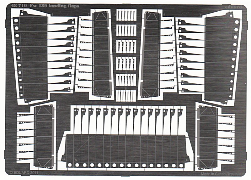 Die metallenen Spreizklappen sind ein wirklich optimales Betätigungsfeld für Fotoätzteilhersteller. Mit kaum einem anderen Verfahren kann man die Struktur dieser leichten und doch stabilen Klappen so gut nachbilden. Man darf sich allerdings nicht täuschen. Obwohl Eduard hier auf "Einfachheit" des Aufbaus hingewirkt hat, ist dies eine sehr komplexe Angelegenheit, die man am fertigen Modell nicht unbedingt in gleichem Ausmaß sieht. Ob man diese Klappen einbaut, sollte man sich also sehr gut überlegen!