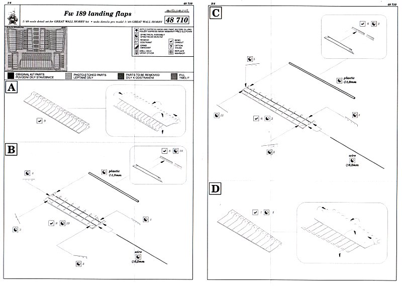 Mit diesem Satz geht es an den Ausbau der Landeklappen Fw 189A. Der Satz enthält eine Fotoätzplatine. In der Bauanleitung wird weiterhin 0,2 mm Draht und 1mm Plastikrundmaterial verwandt. Dieses muss man aus seinem Fundus nehmen bzw. dazu kaufen.