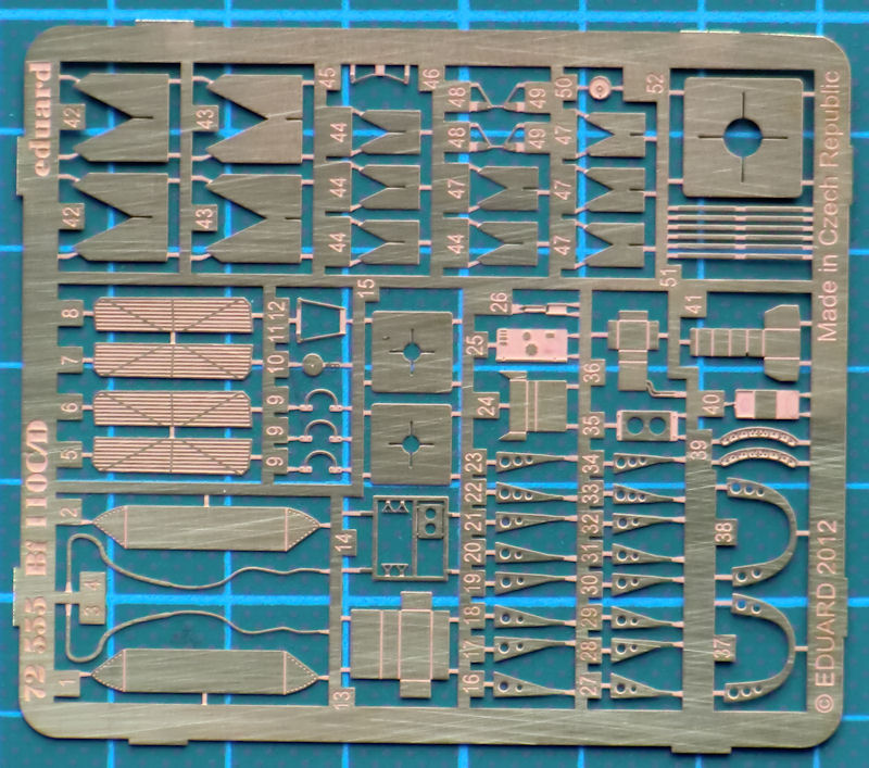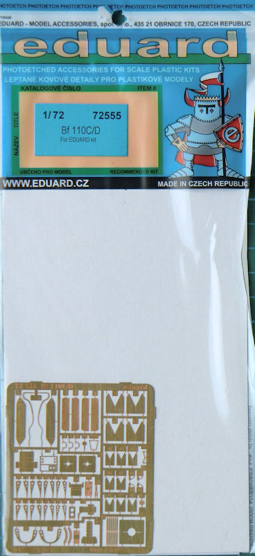 Für den neuen eduard-Bausatz der Messerschmitt Bf 110C/D hat eduard selbst ein Fotoätzteilset für das Äußere des Modells herausgebracht. Das Set enthält u.a. zusätzliche Details für das Cockpit, Spanten für die Hauptfahrwerksschächte, die hinteren Kühlerklappen, diverse Umlenkhebel, Bremsleitungen(!) und Leitwerksfinnen für die Bomben. Das Set ist im übrigen identisch mit dem Set für die Bf 110E.
