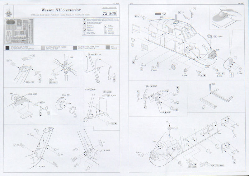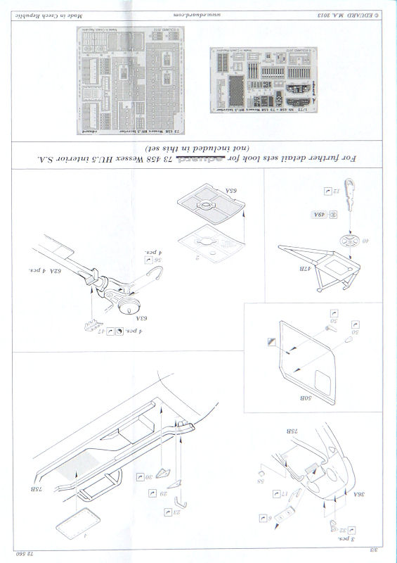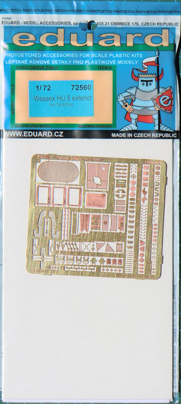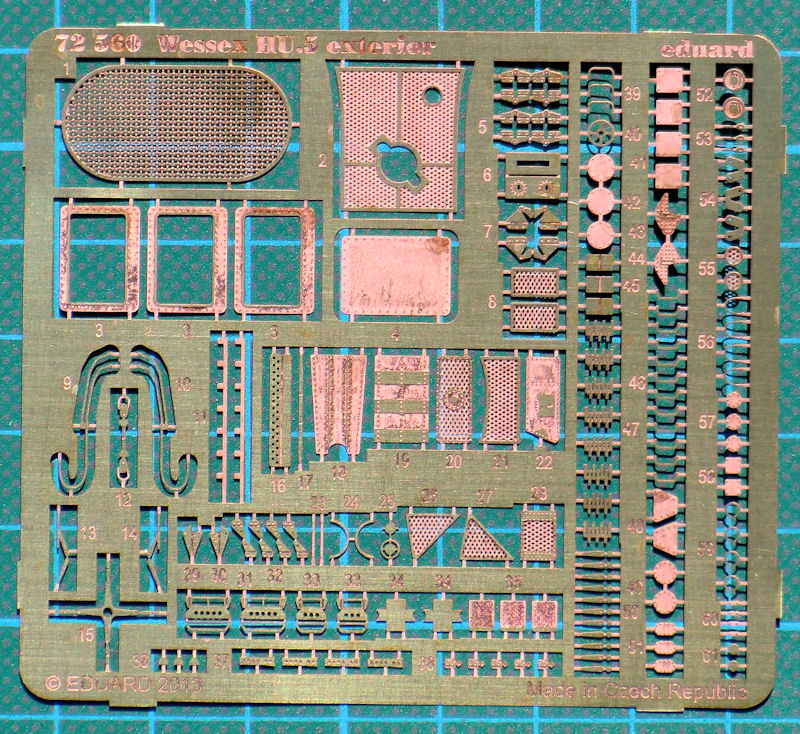 Für den Italeri-Kit der Westland Wessex HU.5 hat eduard u.a. ein Fotoätzteilset herausgebracht. Es enthält einen messigfarbenden Bogen. Dieser Bogen ist für das Äußere der Wessex HU.5. Es gibt zum Beispiel ein Schutzgitter für den großen Lufteinlauf, Kleinteile für den Ausgleichsrotor, das Fahrwerk, eine neue Winde und Vieles mehr.