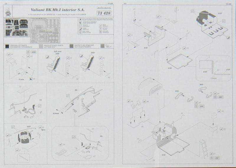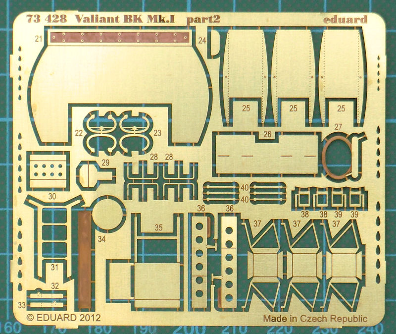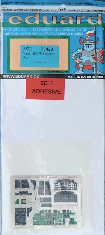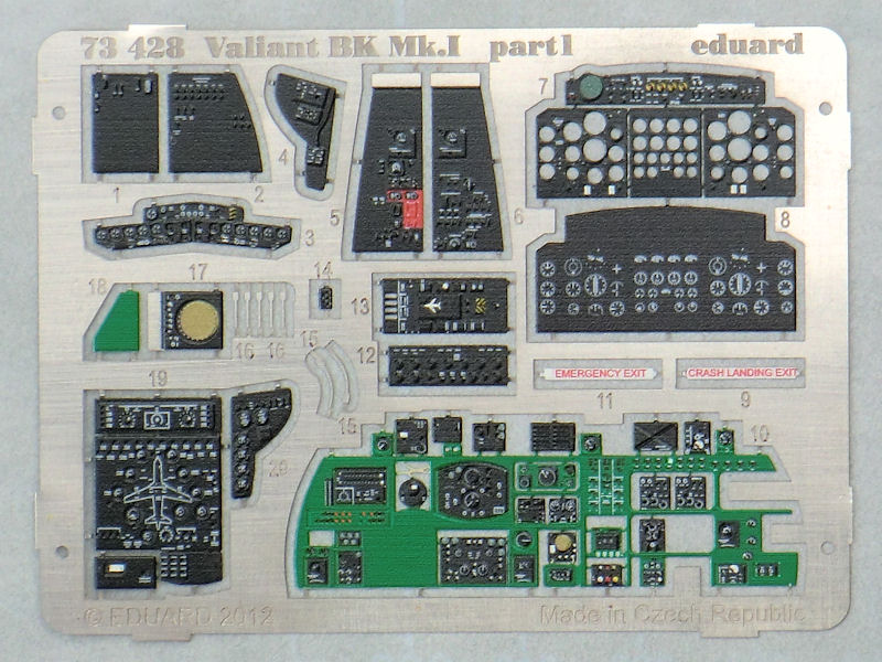 Für den soliden Airfix-Bausatz der Vickers Valiant BK Mk.1 hat eduard ein Fotoätzteilset für das Innere des Modells herausgebracht. Das Set enthält u.a. farbig bedruckte Instrumente für das Cockpit, Details für die Schleudersitze, Pedale, Steuerhörner und weitere Kleinteile. Nur die Sitzgurte sind n i c h t enthalten!