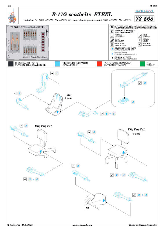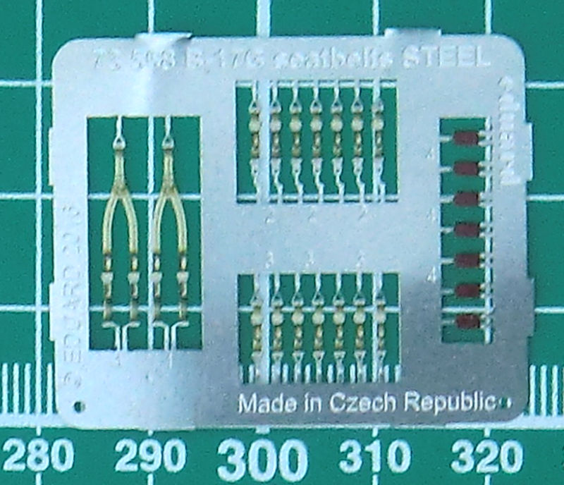 Für den Airfix-Bausatz der Boeing B-17G hat eduard neben diversen Detailsets für Innen und Außen sowie für die Landeklappen auch ein Set für die Sitzgurte herausgebracht. Es enthält eine silberfarbene Platine die übersichtliche Bauanleitung.