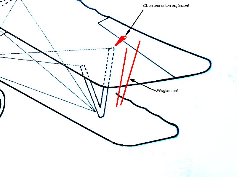 Als nächstes hatte diese Maschine im Original die kleinen Stützstreben vor den äußeren V-Streben obwohl es definitiv eine D.V war – also diese bitte nicht, wie in der Baubeschreibung gefordert, entfernen! Das vmtl. beste Foto von dieser Maschine ist im Osprey "Jagdgeschwader Nr. II" von Greg VanWyngarden auf Seite 40 zu sehen. Dort erkennt man diese kleinen Streben sehr gut und – mit etwas Phantasie – auch die an der vorderen V-Strebe auf der Backbordseite einen Morell-Geschwindigkeitsmesser. Diesen gibt es im Bausatz nicht so das man sich auch hier selbst Abhilfe schaffen muss.