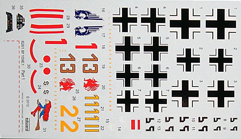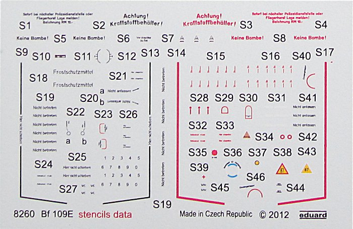 Bemalungen: Eine Vielzahl von Möglichkeiten ergeben sich generell unter der Verwendung älterer und neuer Decalsätze diverser Hersteller und etwas Quellenstudium. Letzteres würde ich auch (wie so oft bei Eduard) auch dringend empfehlen - so erkennt man auf einem Foto der Maschine von Kurt Ubben deutlich, dass der Bereich um die Waffenmündungen der MG 17 herum heller bemalt war und es existiert ein weiteres Foto dieser Maschine bei dem die markante Hexe unter dem Cockpit mit einer helleren Farbe überpinselt und dafür eine weiße 5 als zweite Nummer auf den Rumpf gemalt wurde. Die 2 sauber gedruckten Decalsätze des Bausatzes erlauben den Bau der 5 folgenden Maschinen: