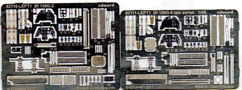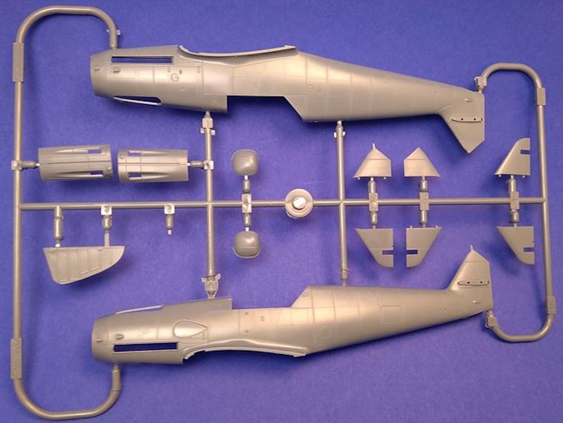 Ansonsten finden sich zwei identische Rahmen- mit der Markierung "Bf 109 FGK" mit Teilen für alle Varianten. Die Teile und die Abziehbilder ermöglichen den Bau einer von vier G-2 Varianten und entweder von einer von sechs G-6-Varianten oder nur von zwei G-6-Maschinen. Alle Steuerflächen, die Vorflügel und die Klappen der Flügelkühler sind separat nachgebildet. Es gibt drei verschiedene Propeller, zwei verschiedene Ladereinläufe, einen Tropenfilter, je ein Spornrad mit kurzem und langem Bein, Seitenleitwerke und -ruder niedrig und hoch, flachen und tiefen Ölkühler, Räder schmal und breit, mit Speichenfelgen und Stahlfelgen sowie mit und ohne Reifenprofil, eine Cockpitrückwand mit Batteriekasten, einen kurzen und einen langen Antennenmast, Kopfpanzer aus Stahl und zwei Versionen aus Panzerglas, Gondelbewaffnung mit MG 131/20mm für Rüstsatz 6, 250 Kg-Bombe mit Träger, Rumpfbombenträger mit 50 kg-Bomben (Rüstsatz 2), 2 verschiedene Zusatztanks mit Trägern, zwei Abdeckbleche mit verschiedenen Durchbrüchen für die Rumpfwaffen als Teile der Motorhaube oder mit separaten Gravuren. Windschutzscheiben ohne bzw. mit zwei Lufthutzen bzw. einer Hutze und einer Leuchtpistolenöffnung, eine dreiteilige und drei verschiedene Erla-Hauben.