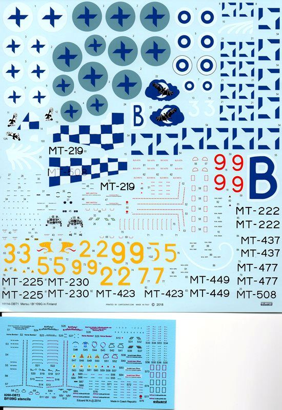 Bausatz: Im stabilen Stülpkarton mit attraktivem Deckelbild in den finnischen Nationalfarben finden sich eine farbige 32-seitigeHochglanzbauanleitung, ca. 400 blaugraue Kunststoffteile in wiederverschließbaren Tüten verpackt (von denen ein guter Teil in die Ersatzteilkiste wandert), 28 Klarsichtteile, ein ca. DIN-A4-großer Abziehbilderbogen italienischer Provenienz, zwei Rahmen bedruckte Fotoätzteile und Eduards Lackiermasken, letzteres alles in Clipbeuteln. Die Qualität ist wie von den letzten Bausätzen her bekannt makellos, Grat fehlt gänzlich, Auswerfermarkierungen sind an Stellen gelegt worden, wo sie nach dem Bau unsichtbar bleiben. Die Oberfläche zeigt feinste versenkte Gravuren in verschiedenen Stärken und auch die Nieten sind in mehreren Varianten zu finden. Die Glasteile sind dünn und klar.