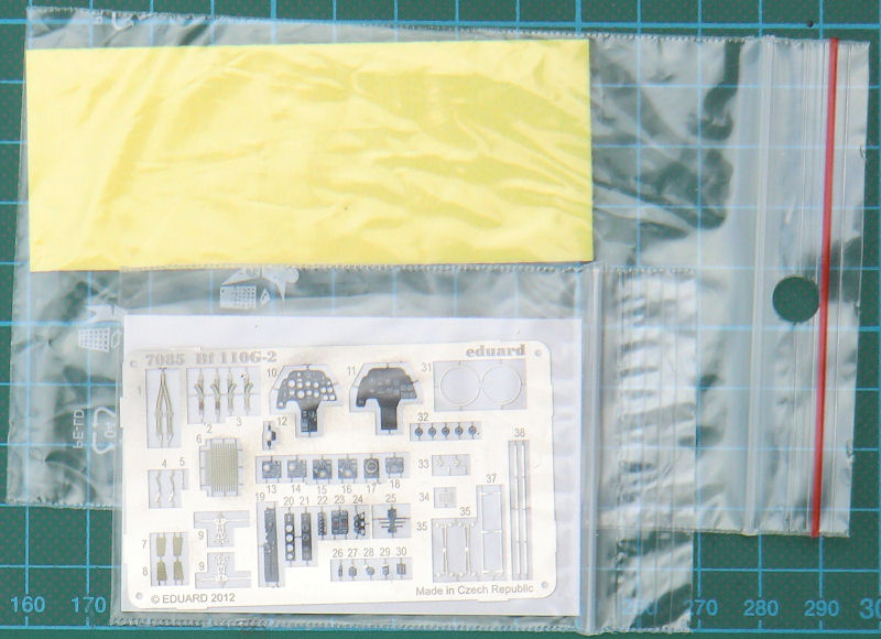 Bausatz: eduard legt hiermit die G-2-Version dieses bemerkenswerten Bf 110-Bausatz nach. In dem deutlich vergrößerten Stülpkarton befinden sich gut verpackt sechs grau Spritzlinge mit 192 Einzelteilen, ein Klarsichtrahmen mit zwölf Teilen, einen mehrfarbig bedruckten Fotoätzteilbogen, gelbe Masken, ein Decalbogen und die gut gemachte Bauanleitung sowie eine Menge Luft(!). Der Karton hätte ruhig so handlich bleiben können wie bei den 110er-Bausätzen zuvor. Leider kostet diese Luft auch noch ein paar Euro :-( mehr gegenüber den vorher erschienenen Profi-Packs.