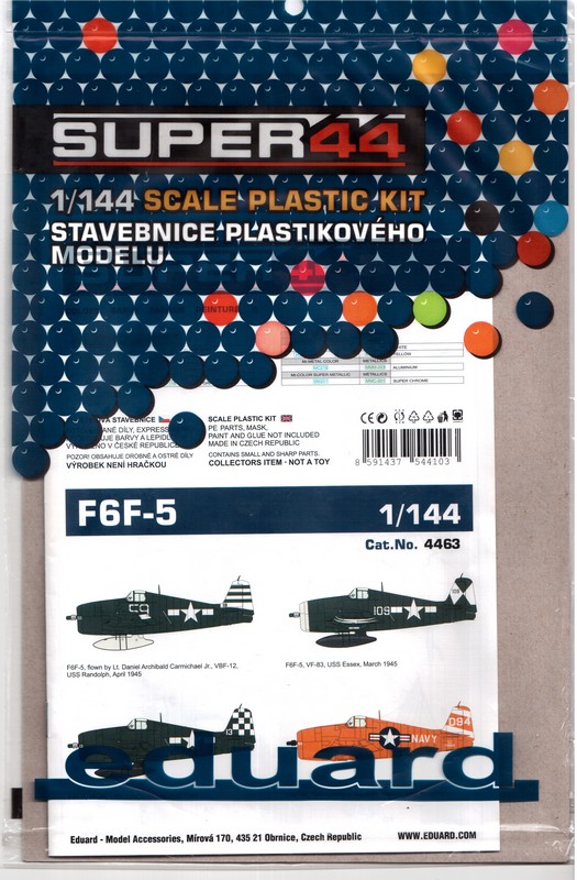 Bausatz: Eduard baut seine 1/144er Linie auch weiterhin kontinuierlich aus. In dem neuen Format mit einem einzelnen Bausatz in einer Plastiktüte ist nun die F6F-5 Hellcat erschienen. Auch bei diesem Kit stammen die Formen von der japanischen Firma PLATZ. Das Modell stellt eine mittlere bis späte Maschine der -5 Serie da. Dies ist zum Beispiel gut an den fehlenden kleinen Seitenfenstern zu erkennen. Die etwas mehr als 30 Teile finden sich an zwei Spritzrahmen in grauen Kunststoff und einen aus klarem Plastik.