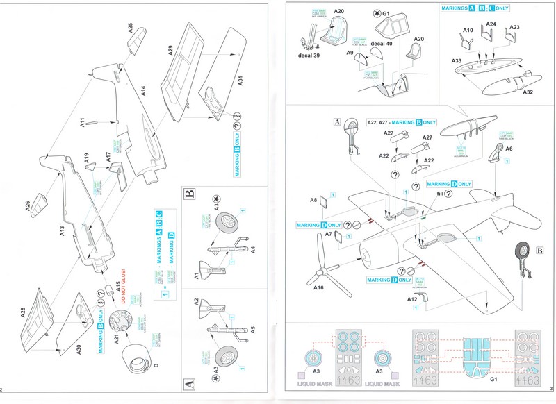 An Außenlasten gibt es den typischen Zusatztank für die Rumpfmittelstation und zwei kleinere Bomben samt einzelnen Pylonen. Zum Lieferumfang gehören auch Abdeckmasken für die Lackierung. Den Bau des Modells zeigt sehr gut die farbige Bauanleitung im klaren Stil. Farbangaben werden auch für Details gemacht und beziehen sich auf das Programm von Mr. Hobby GSI Creos sowie Mission Models Paints. Sehr ausführlich inkl. Geschichten zum Vorbild präsentieren sich auch die gewählten Bemalungen.