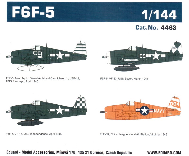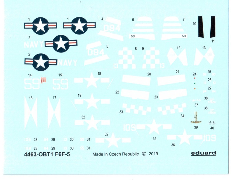 Die nötigen Decals finden sich auf einem Bogen, welcher bei eduard selber gedruckt wurde. Die Qualität des glänzenden Drucks wirkt gut. Deutlich wird dies zum Beispiel bei den verschiedenen geometrischen Markierungen in weiß. Insgesamt kann man aus vier Vorbildern wählen. Dabei handelt es sich um drei Einsatzmaschinen in Sea Blue über alles und eine ferngelenkte Drohne aus der Nachkriegszeit in grellem Orange. Die folgenden Vorbilder können dargestellt werden: