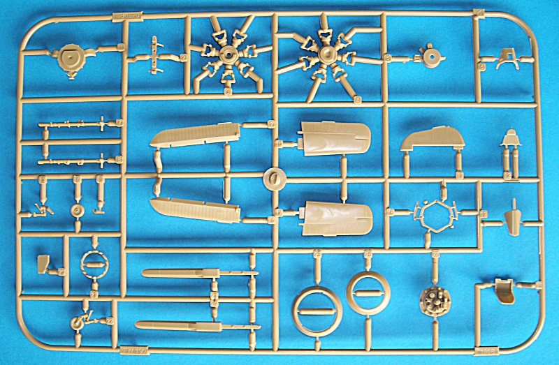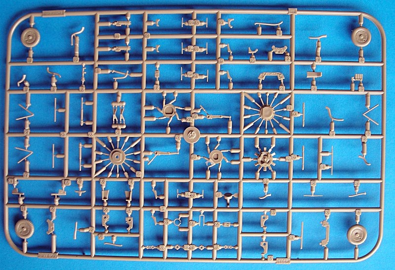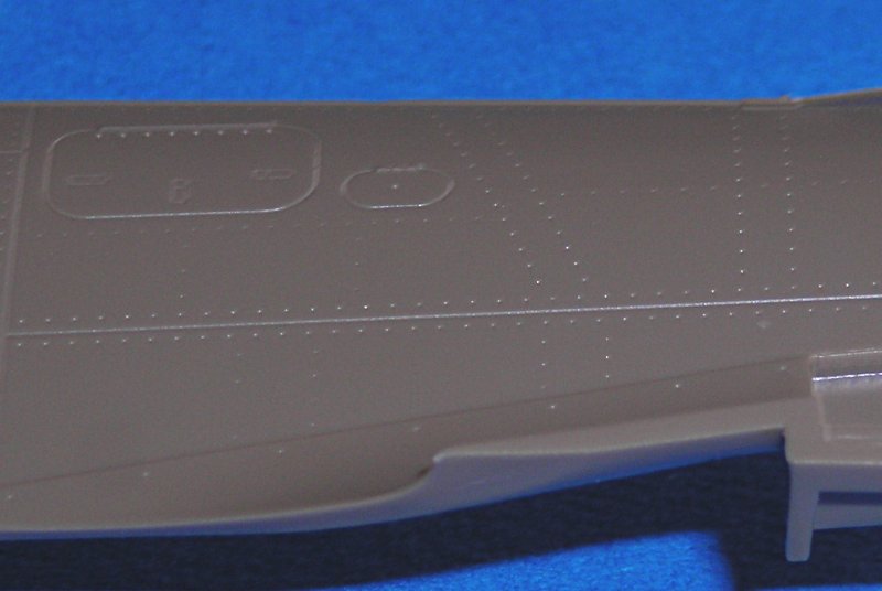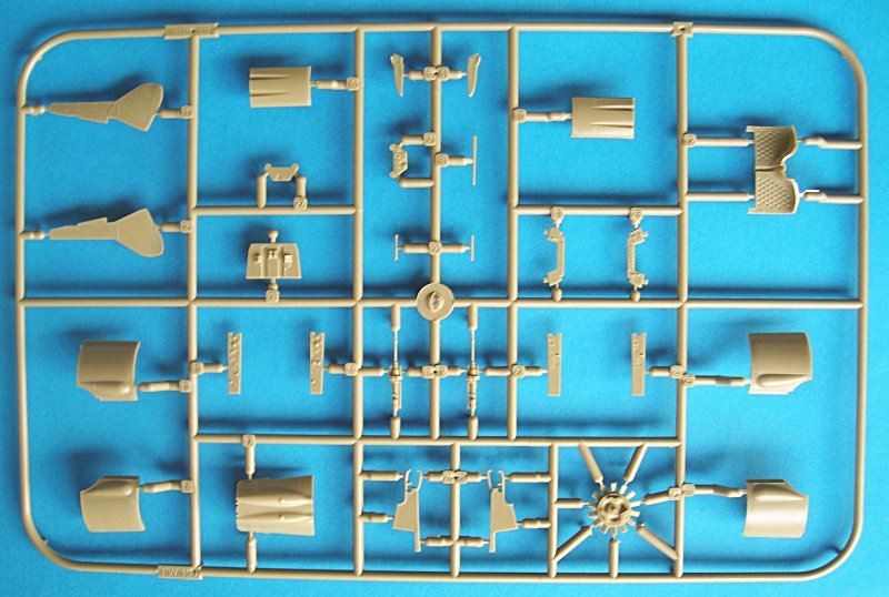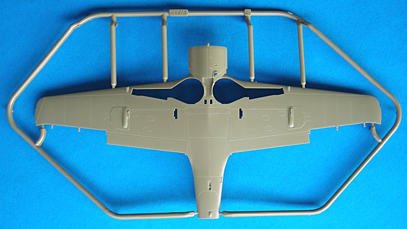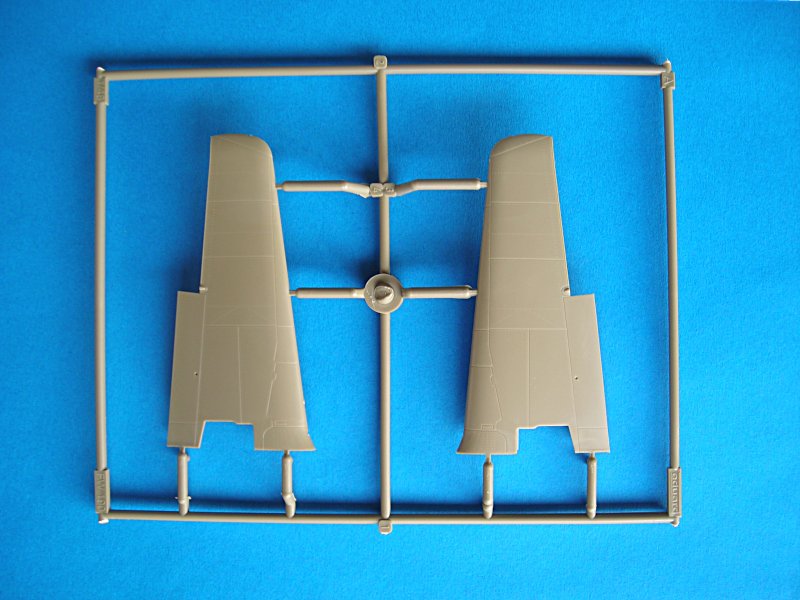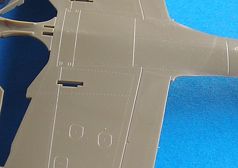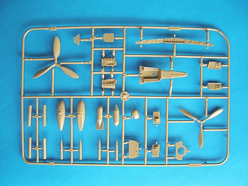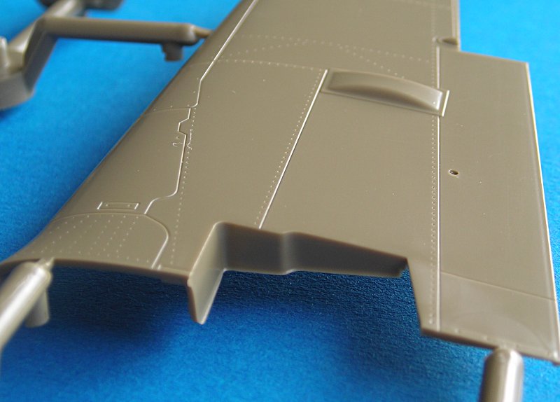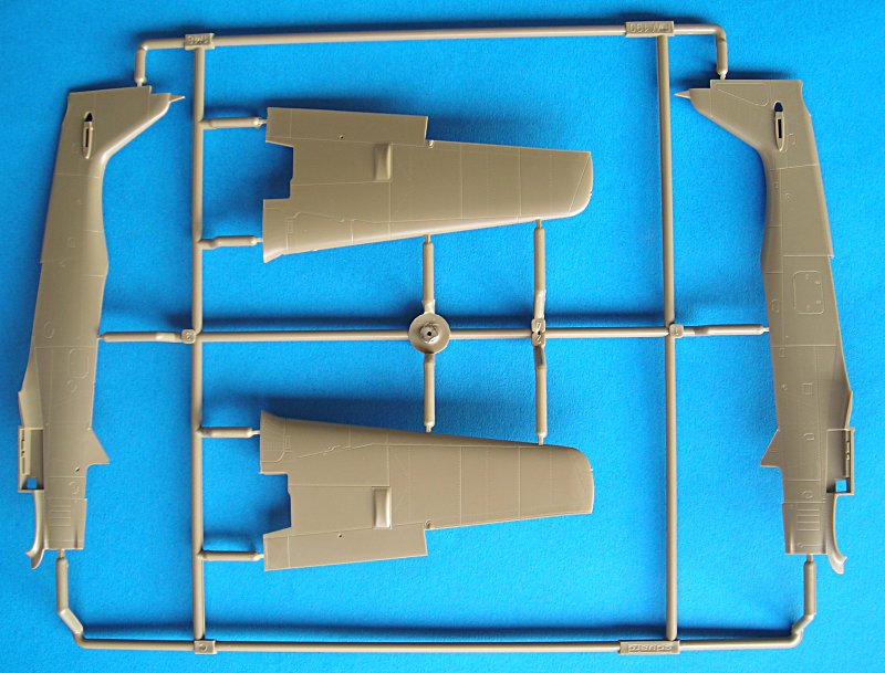 Die Plastikteile sind alle sehr gut abgespritzt und haben keinen erkennbaren Grat. Eduard hat sogar die derzeitige Mode berücksichtigt und das gesamte Modell mit feinsten Nietenreihen überzogen (siehe Detailfotos). Für jede Variante wird es extra Rumpfhälften geben, also kein zu-spachteln und schleifen und auch keine "20-Bauteile-Rumpfhälften" a la Hasegawa P-40. Ebenfalls separat liegen zwei verschiedene Oberflügel bei (mit und ohne Buckel für die Außenwaffen). Seiten- und Querruder liegen als Einzelteile vor. Auch ein weiteres Ärgernis bei einigen bisherigen Modellen wurde beseitigt, das Spornrad ist ein richtiges Rad mit zwei Teilen für die Gabel (man kann aber auch das ebenfalls beiliegende einteilige Spornrad verwenden (wovon ich allerdings abraten würde).