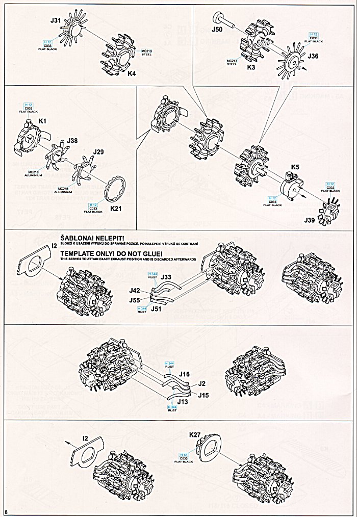 Natürlich liegen dem Bausatz auch wieder Masken und Ätzteile bei, so dass man auf ein schönes "Out of the box" Bastelerlebnis hoffen kann. Unklar ist noch, wie gut die Klappen für die Flügelwurzelbewaffnung passen, wenn diese nicht offen dargestellt wird. Man kann gar nicht alle positiven Merkmale des Bausatzes aufzählen, immer fallen einem noch neue ein (zum Beispiel der komplett beiliegende Motor, man beachte die Montagehilfe für die einzelnen Auspuffstränge .. siehe Scan aus der Bauanleitung), deshalb verweise ich auf die Fotos.