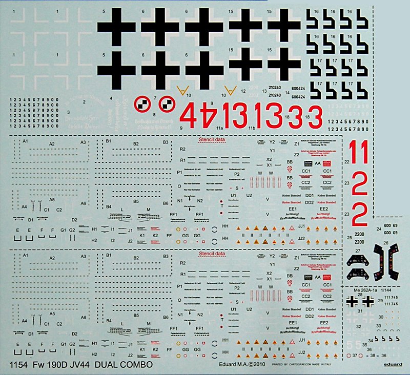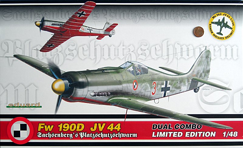 Bausatz: Wie bereits auf der Spielwarenmesse 2010 angekündigt, lieferte Eduard kurz vor Jahresende diesen Bausatz aus. Dabei handelt es sich im Wesentlichen um eine Collectors Edition, wie man an vielen kleinen Dingen feststellen kann. Aus der Box können eine Fw 190D-9 und eine Fw 190D-11 in 1/48 und eine Me 262 in 1/144 gebaut werden. Letztere ist z.B. eines der Gimmicks dieser Collectors Edition, auf den ich nicht näher eingehen will. Jedenfalls ist die Box so gut gefüllt, dass ich nach dem Fotografieren Schwierigkeiten hatte, alles wieder zu verstauen. (Platz für Alternativteile zum Bau zweier Fw 190 D-9 ist jedenfalls nicht)